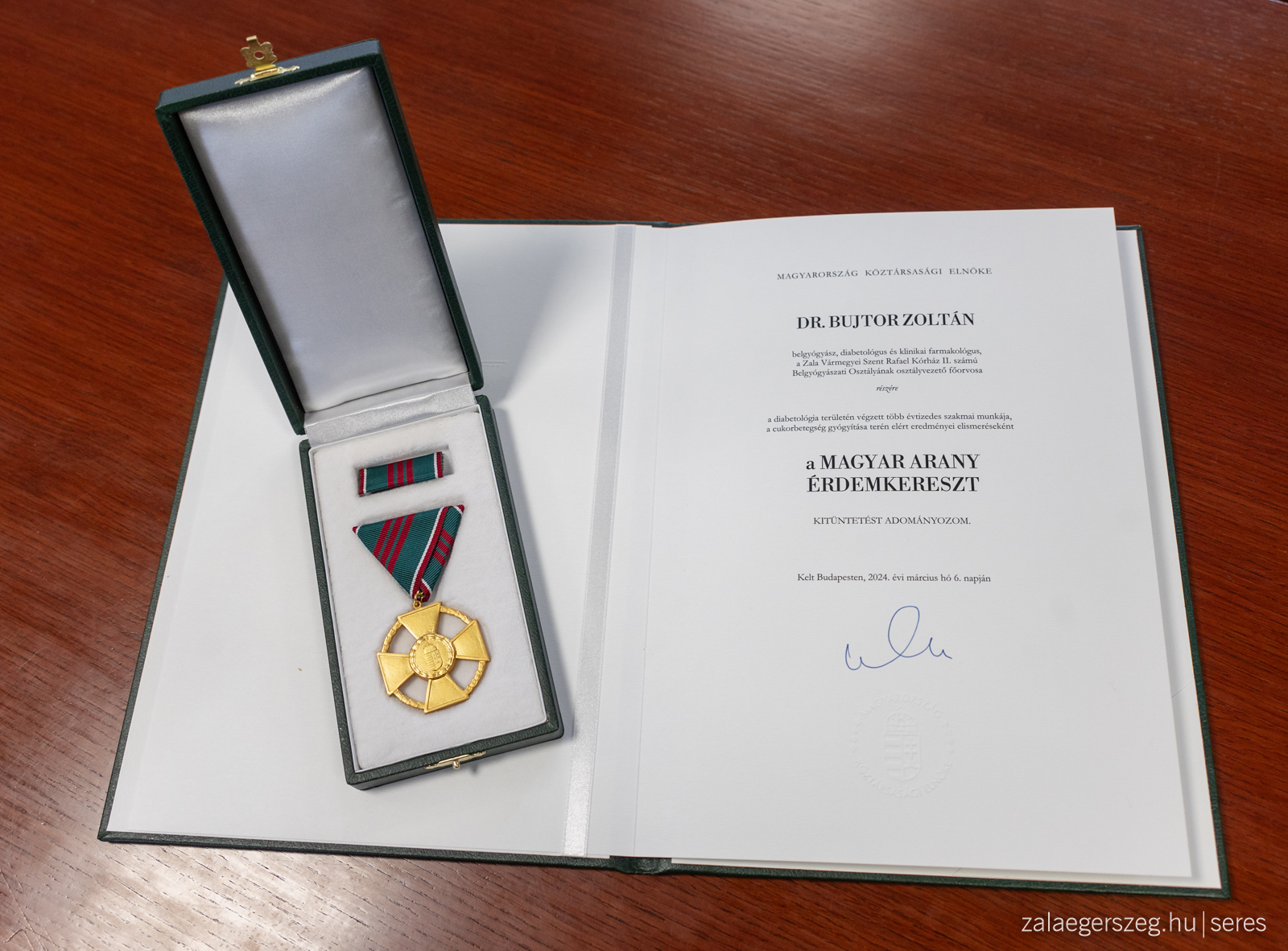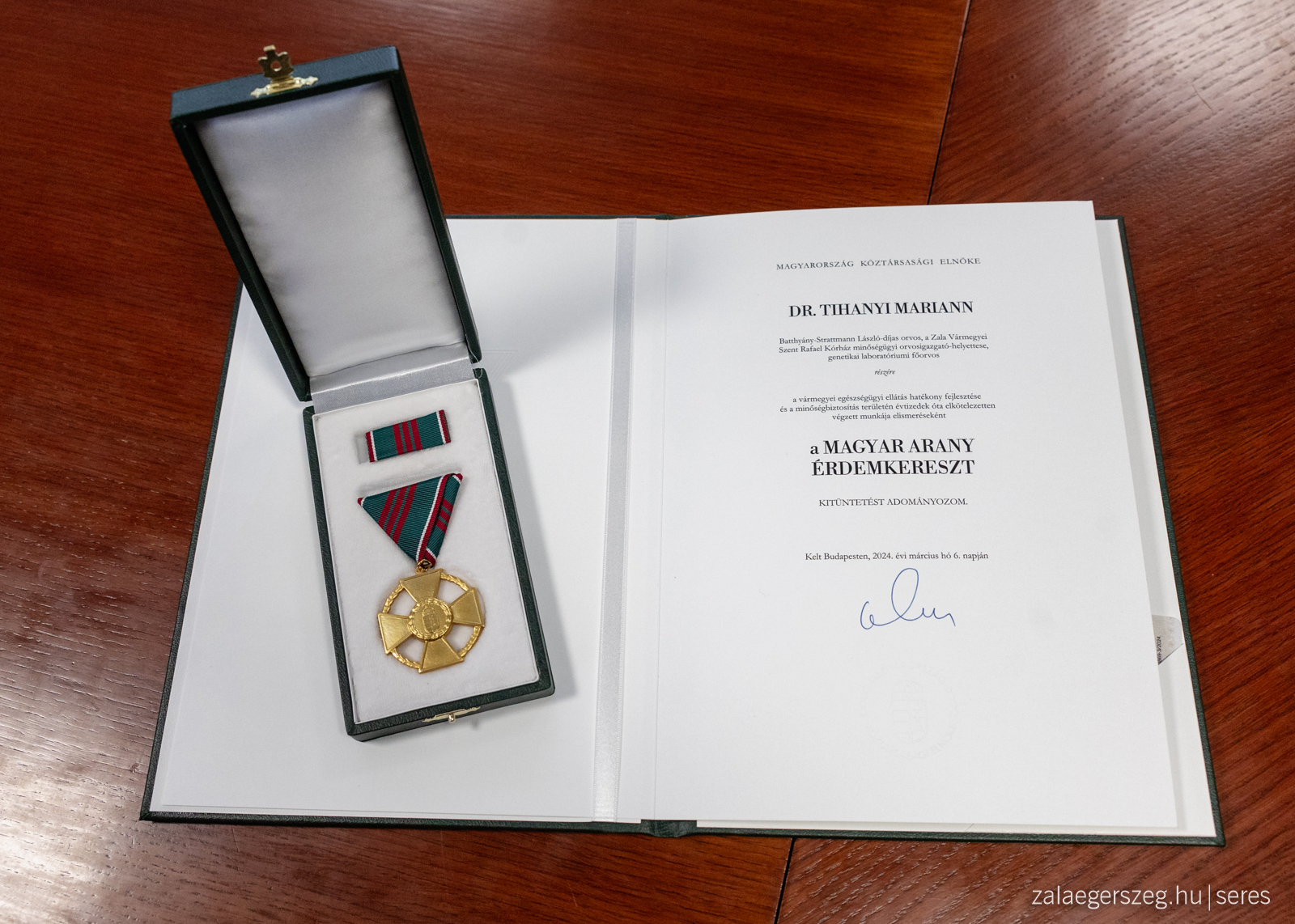 Az 1848-49-es Forradalom és Szabadságharc kitörésének 176. évfordulója alkalmából állami kitüntetésben részesült zalaegerszegiek köszöntése a Városházán: : Dr. Sifter Rózsa, a Zala Vármegyei Kormányhivatal főispánja Batthyány Lajos Díjat, Dr. Tihanyi Mariann, a Zala Vármegyei Szent Rafael Kórház minőségügyi orvos-igazgató helyettese Magyar Arany Érdemkeresztet, Dr. Bujtor Zoltán, a Zala Vármegyei Szent Rafael Kórház osztályvezető főorvosa Magyar Arany Érdemkeresztet, Kiss Gábor főkönyvtáros, a Deák Ferenc Megyei és Városi Könyvtár nyugalmazott igazgatója Magyar Arany Érdemkeresztet, Dr. Tóth László, az egykori Zala Takarékszövetkezet elnök-ügyvezetőjének Magyar Ezüst Érdemkeresztet vett át. A köszöntőn nem tudott jelen lenni: Bali József, a Zalaispa Zrt. elnök-vezérigazgatója, aki Magyar Ezüst Érdemkeresztet és Dr. Szabó Csaba, a Magyar Nemzeti Levéltár zalaegerszegi születésű főigazgatója, aki pedig Magyar Érdemrend Tisztikeresztet kapott. (2024.03.21.) - Fotó: Seres Péter